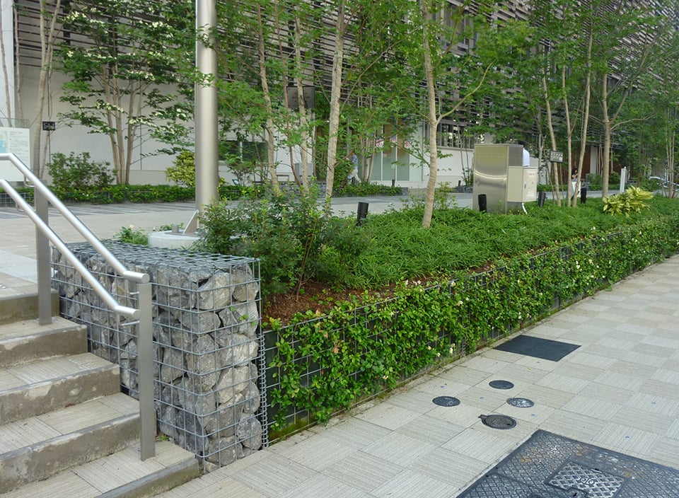 自然の石を使用し積み上げるかごマット工法により、景観を損なわずに、わずかな期間で植物の緑がよみがえります。